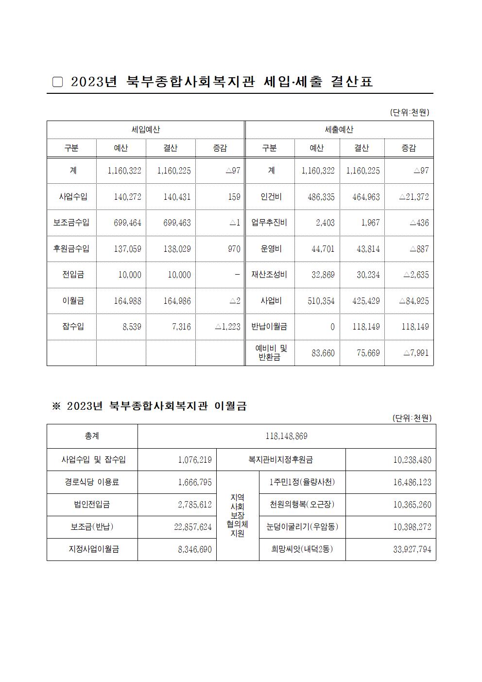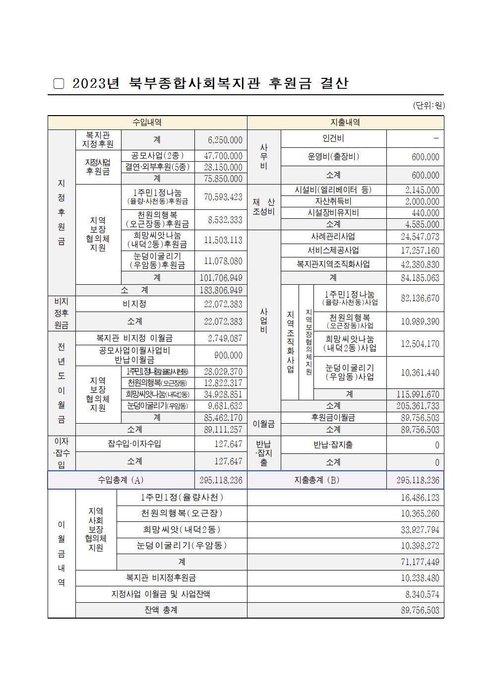 2023년 북부종합사회복지관 결산 및 후원금 사용 내역