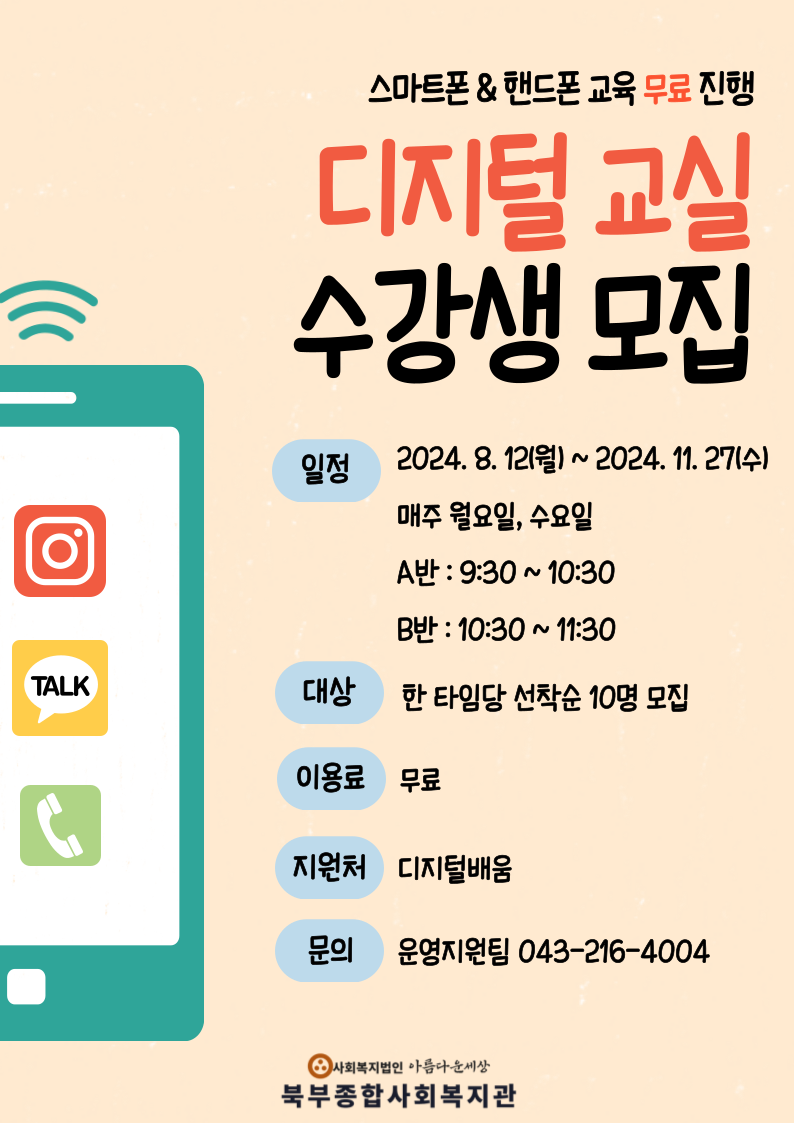디지털 교실 수강생 모집 페이지 정보 작성자 작성자 관리자 작성일작성일 2024.07.17 조회조회 238 본문 첨부파일 디지털 교실 수강생 모집 이전글2024년 은빛문화센터 하반기 참여자 모집 다음글2023년 중장년 갱년기 예방을 위한 꽃중년 갱년기 극복 프로그램 성과 공유 목록 댓글목록 0 댓글목록 등록된 댓글이 없습니다.