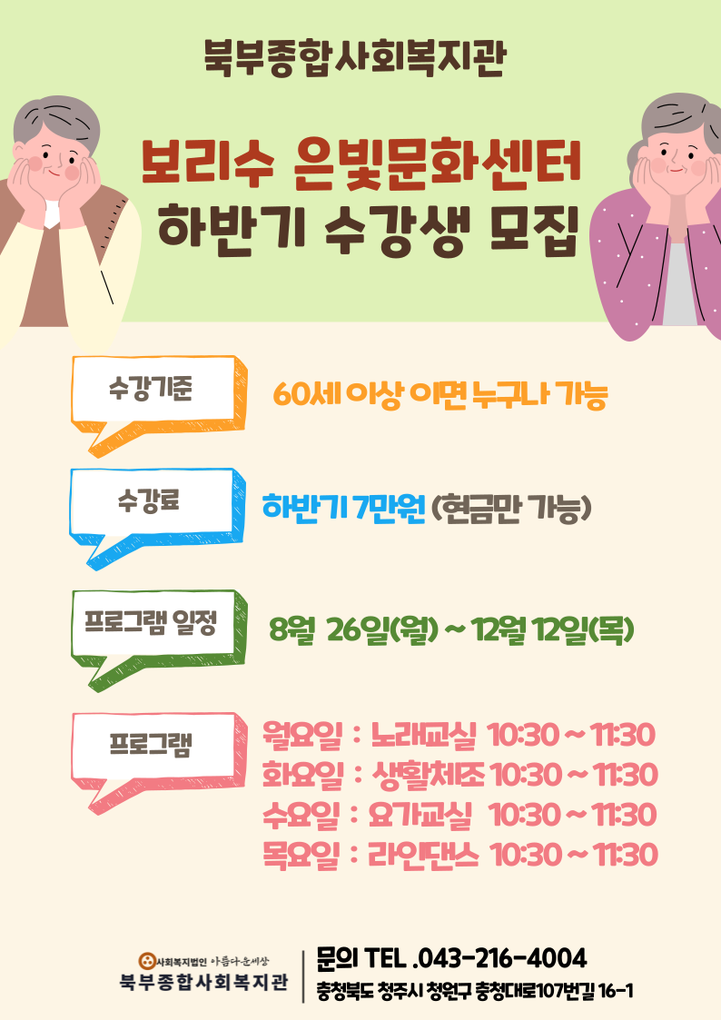 2024년 은빛문화센터 하반기 참여자 모집 페이지 정보 작성자 작성자 관리자 작성일작성일 2024.08.06 조회조회 295 본문 첨부파일 2024년 은빛문화센터 하반기 참여자 모집 이전글글마루도서관 감성 캘리그라피 참여자 모집 다음글디지털 교실 수강생 모집 목록 댓글목록 0 댓글목록 등록된 댓글이 없습니다.
