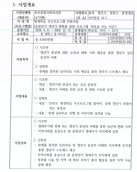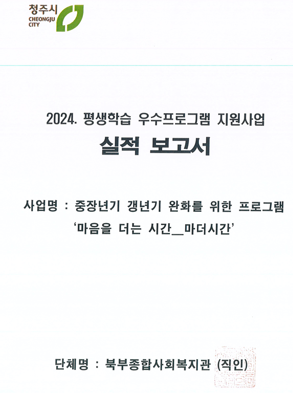 2024년도 마음을더는시간 프로그램 성과 공유 페이지 정보 작성자 작성자 관리자 작성일작성일 2024.10.31 조회조회 271 본문 첨부파일 2024년도 마음을더는시간 프로그램 성과 공유 이전글한국병원 건강교실 진행 안내 다음글(게시글 필독!) 2025년 아동방학교실(동계) 신청 안내 목록 댓글목록 0 댓글목록 등록된 댓글이 없습니다.