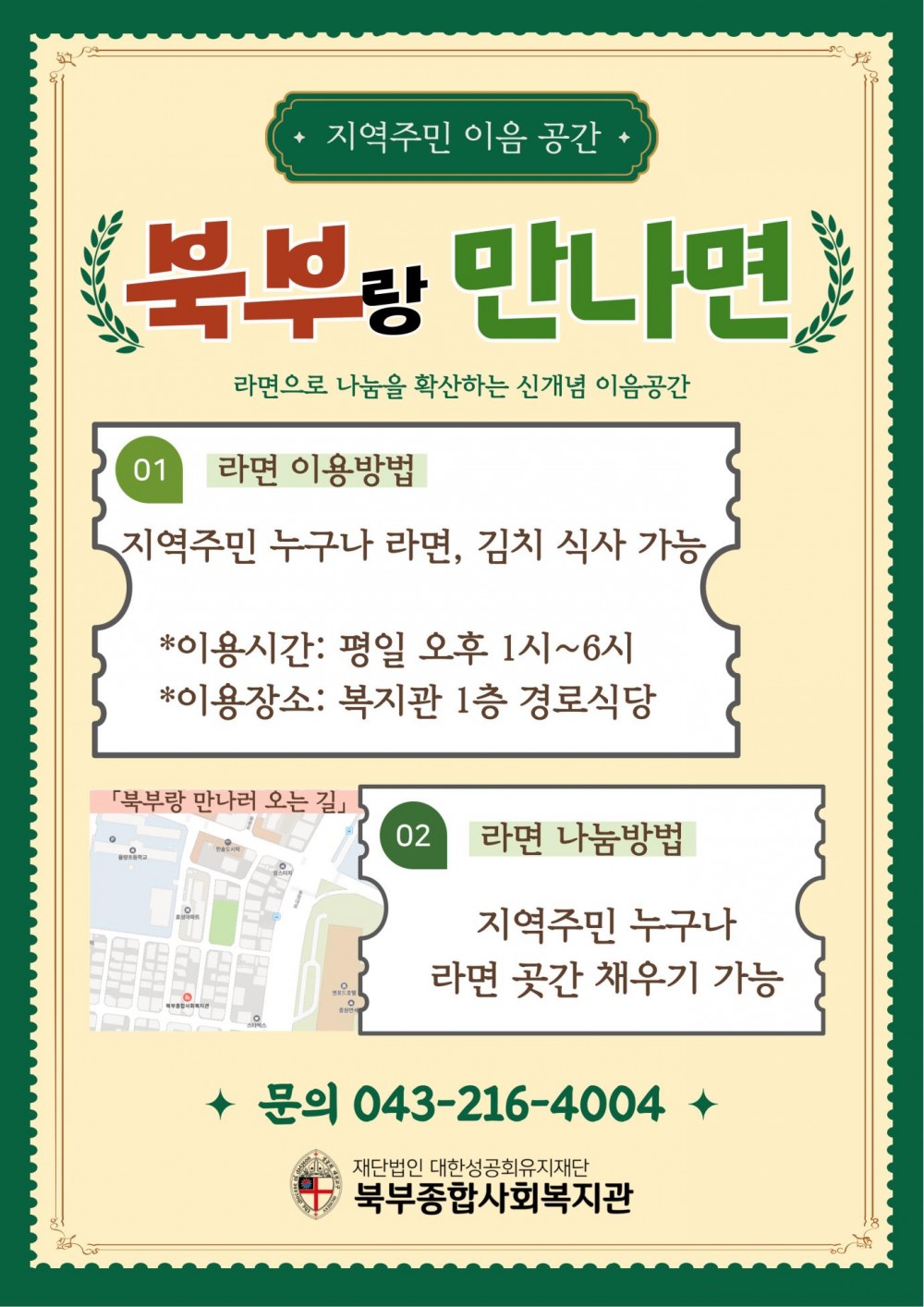 북부랑 만나면 운영안내 페이지 정보 작성자 작성자 관리자 작성일작성일 2025.07.07 조회조회 210 본문 첨부파일 북부랑 만나면 운영안내 이전글[언론보도] (사)해피맘 충북센터, 북부종합사회복지관에 '취반기' 후원 다음글[언론보도] 북부종합사회복지관 나눔과 소통의 '북부랑 만나면' 개소 목록 댓글목록 0 댓글목록 등록된 댓글이 없습니다.