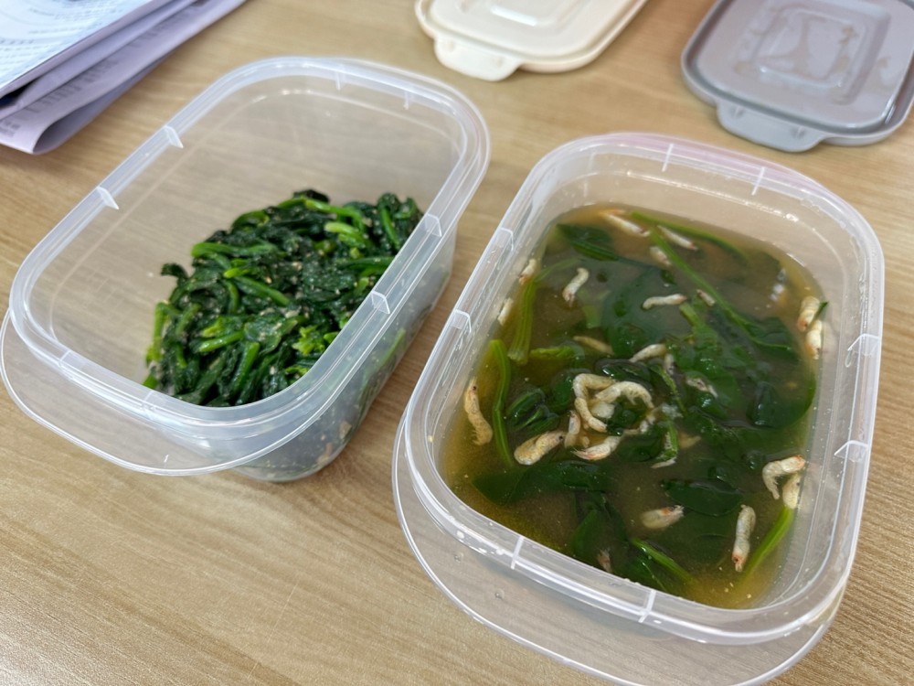 내용: '더 우아한 시니어의 일품 요리 교실' 1회기 요리실습 - 보리새우 시금치된장국&시금치나물