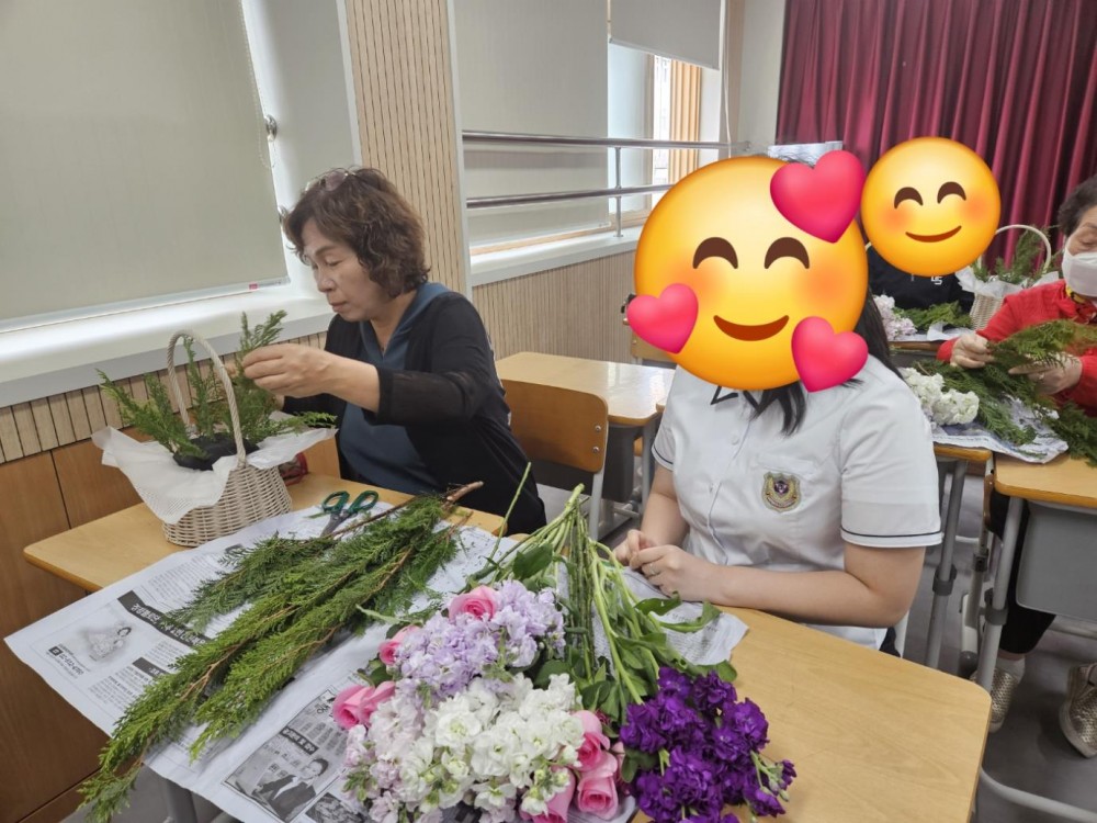 학생들과 어르신들이 같이 꽃바구니를 만들며 즐거운 시간을 보낼 수 있었습니다. 감사합니다!
