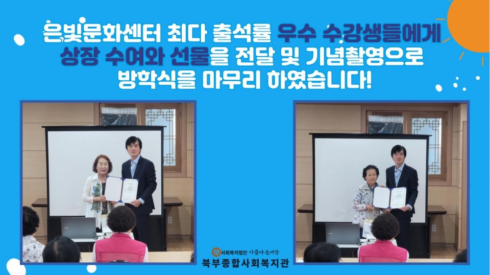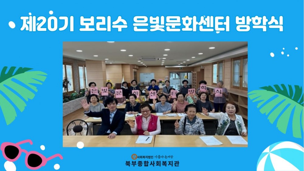 2024년 제20기 보리수 은빛문화센터 방학식 페이지 정보 작성자 작성자 관리자 작성일작성일 2024.06.27 조회조회 252 본문 2024년 제20기 보리수 은빛문화센터 방학식 이전글2024년 '더 우아한 시니어의 일품 요리 교실' 6회기 진행(수육&얼갈이겉절이) 다음글2024년 이미용 서비스 3회기 실시 목록