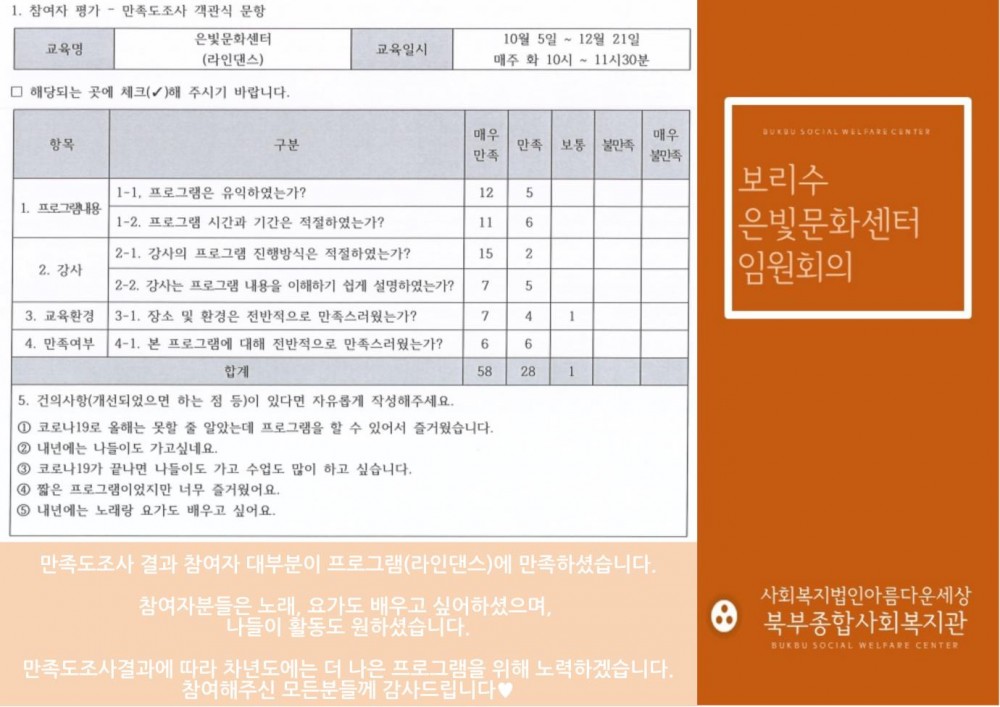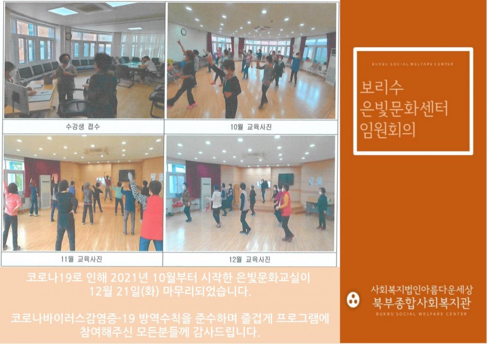 21년 보리수은빛문화센터 활동 성과 공유 페이지 정보 작성자 작성자 관리자 작성일작성일 2021.12.21 조회조회 488 본문 21년 보리수은빛문화센터 활동 성과 공유 이전글이미용 다음글지구와 함께하는 업사이클링공예 목록