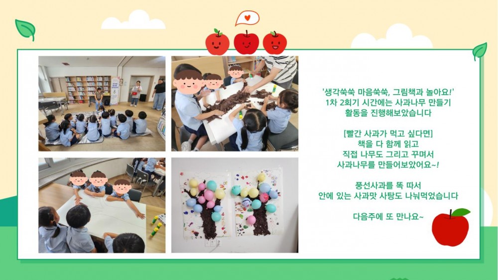 [빨간 사과가 먹고 싶다면] 책을 다 함께 읽고 직접 나무도 그리고 꾸며서 사과나무를 만들어보았어요~!