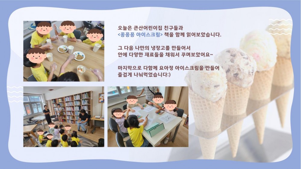 오늘은 큰산어린이집 친구들과 <꽁꽁꽁 아이스크림> 책을 함께 읽어보았습니다.