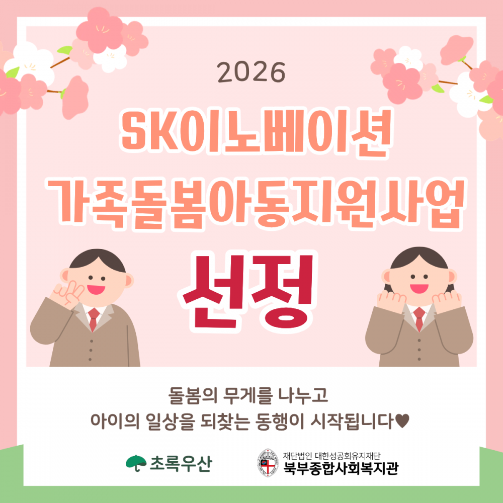 우리 기관에서는 초록우산 어린이재단과 SK이노베이션이 지원하는「2026 가족돌봄아동 지원사업 행복배달 Knock Knock Care」에 사례관리 아동 1명이 선정되었음을 안내드립니다.