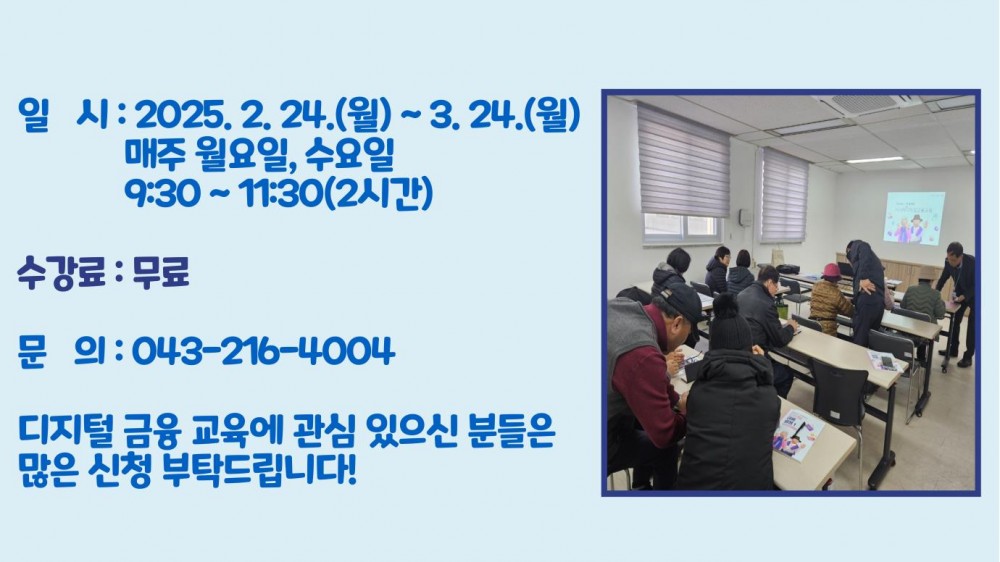 2025년 디지털배움터 금융교육 진행 페이지 정보 작성자 작성자 관리자 작성일작성일 2025.02.24 조회조회 207 본문 2025년 디지털배움터 금융교육 진행 이전글2025년 문해교육 한문교실 진행 다음글2025년 이혈서비스 진행 목록
