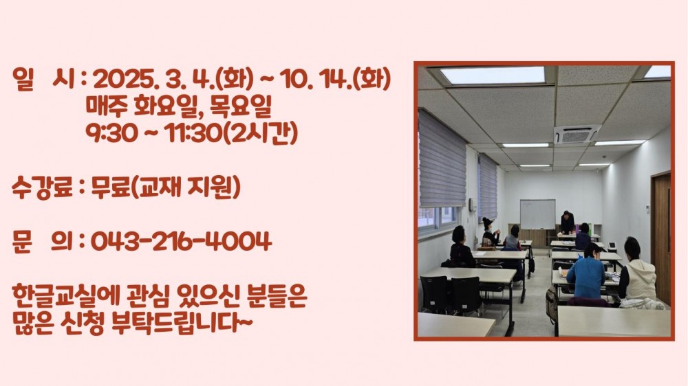2025년 문해교육 한글교실 진행 페이지 정보 작성자 작성자 관리자 작성일작성일 2025.03.04 조회조회 188 본문 2025년 문해교육 한글교실 진행 이전글2025년 이혈서비스 2회기 진행 다음글2025년 은빛문화센터 입학식 진행 목록