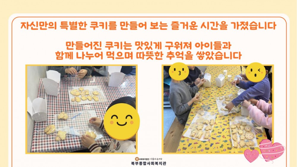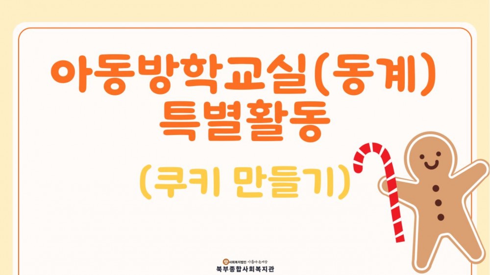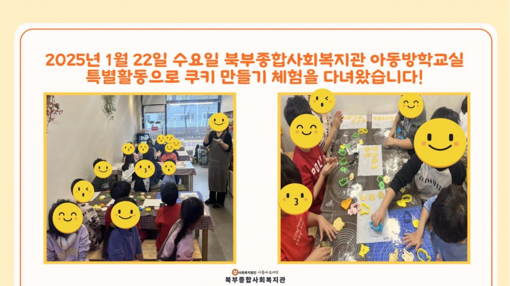 2025년 아동방학교실(동계) 특별활동 (쿠키 만들기) 페이지 정보 작성자 작성자 관리자 작성일작성일 2025.01.22 조회조회 200 본문 2025년 아동방학교실(동계) 특별활동 (쿠키 만들기) 이전글중소기업사랑나눔재단 설맞이 특식 나눔 봉사활동 다음글청주미용학원 · 착한미용실 업무협약식 목록