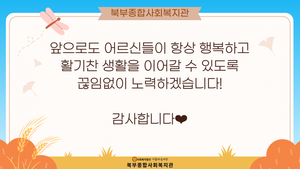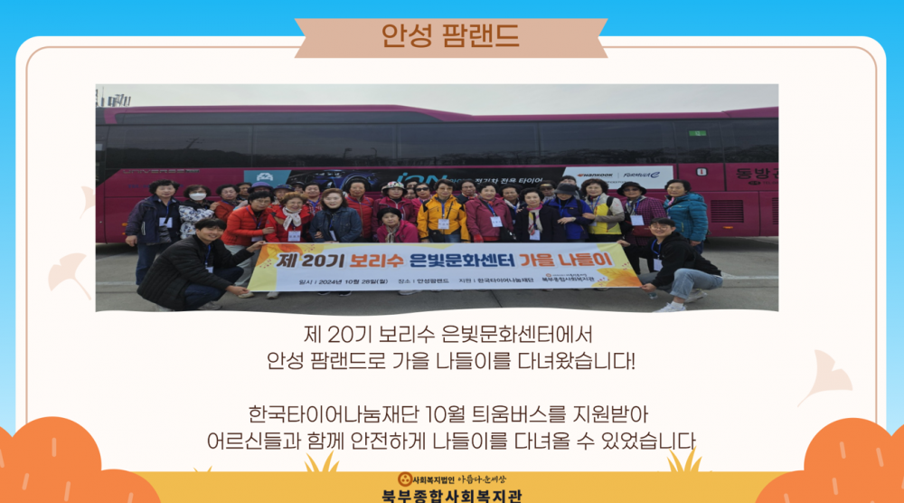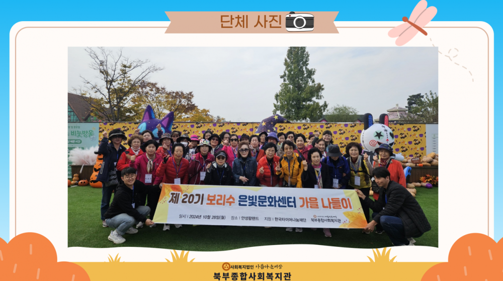 제20기 보리수 은빛문화센터 가을나들이 페이지 정보 작성자 작성자 관리자 작성일작성일 2024.10.28 조회조회 380 본문 제20기 보리수 은빛문화센터 가을나들이 이전글2024년 지역주민 및 이용자 자살예방교육 다음글2024년 DB손해보험 약속 상자 후원 목록