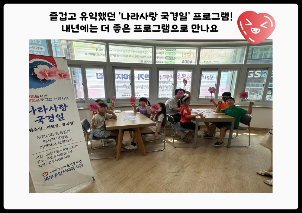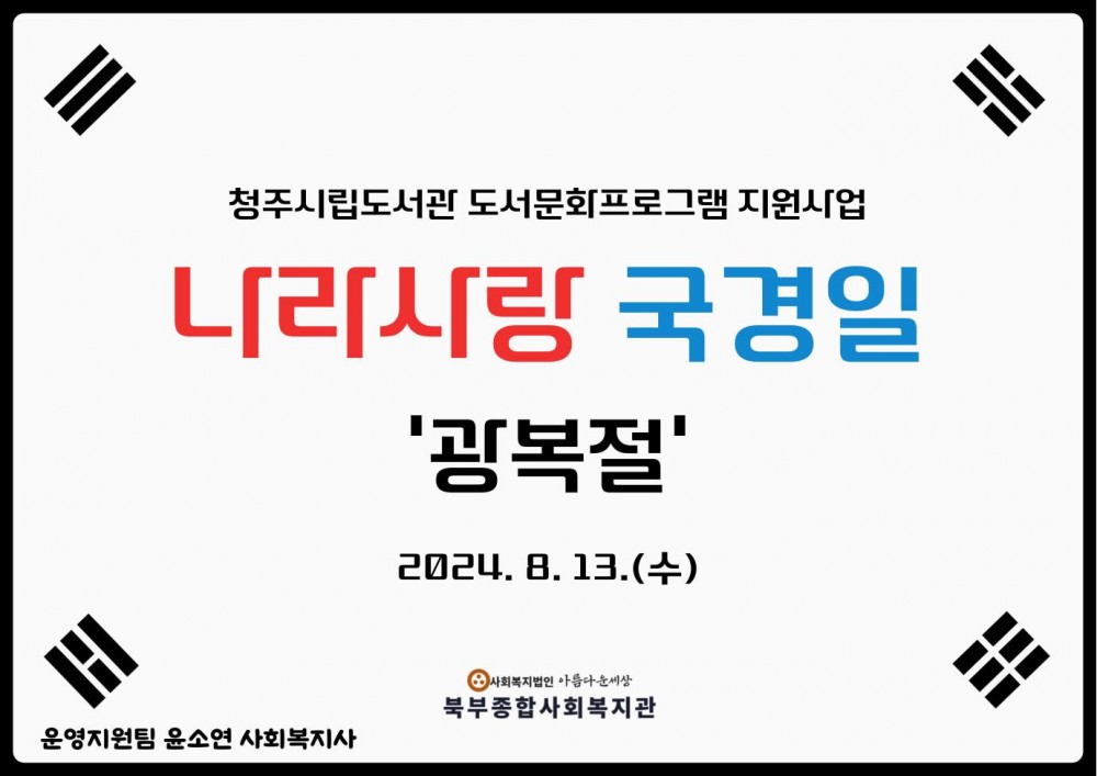 2024년 청주시립도서관 지원 사업 '나라사랑 국경일(광복절)' 페이지 정보 작성자 작성자 관리자 작성일작성일 2024.08.14 조회조회 195 본문 2024년 청주시립도서관 지원 사업 '나라사랑 국경일(광복절)' 이전글2024년 청주시립도서관 지원 사업 '여성독립운동가의 발자취를 찾아서' 다음글24년도 독거남성요리교실 프로그램 성과 공유 목록