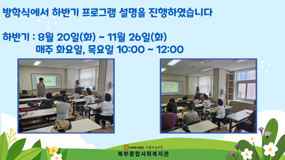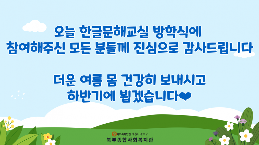한글문해교실 방학식 페이지 정보 작성자 작성자 관리자 작성일작성일 2024.07.25 조회조회 280 본문 한글문해교실 방학식 이전글2024 청소년자원봉사학교 다음글무더위쉼터 기획프로그램 실시 목록