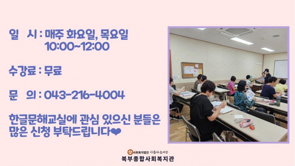 2024년 평생학습 하반기 한글교실 진행 페이지 정보 작성자 작성자 관리자 작성일작성일 2024.08.20 조회조회 179 본문 2024년 평생학습 하반기 한글교실 진행 이전글8월 행복꽃이 피었습니다♥ (with LG에너지솔루션) 다음글2024년 디지털배움터 스마트폰교 목록