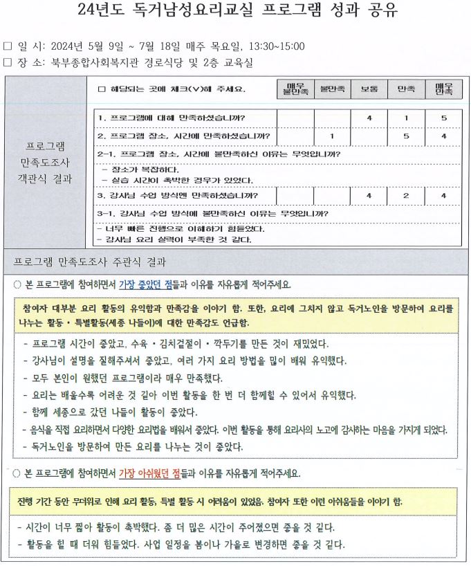 2024년도에 진행된 독거남성 요리교실 ' 더 우아한 시니어의 일품요리' 프로그램 성과를 공유 합니다.
