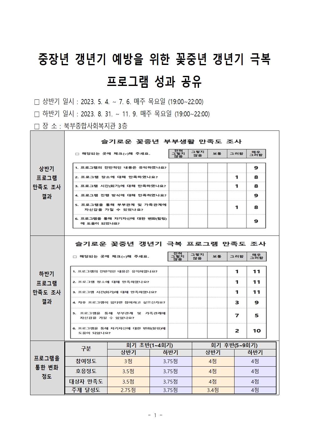 2023년 중장년 갱년기 예방을 위한 꽃중년 갱년기 극복 프로그램 성과 공유 페이지 정보 작성자 작성자 관리자 작성일작성일 2023.11.10 조회조회 97 본문 첨부파일 2023년 중장년 갱년기 예방을 위한 꽃중년 갱년기 극복 프로그램 성과 공유 이전글디지털 교실 수강생 모집 다음글2023년 치매예방 프로그램(라탄공예) 프로그램 성과 공유 목록 댓글목록 0 댓글목록 등록된 댓글이 없습니다.