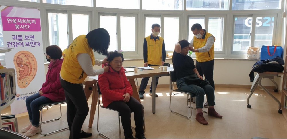 이혈봉사는 혈압 측정을 하고, 귀를 통해 건강을 확인하여 간단한 상담과 패치 부착을 진행합니다.