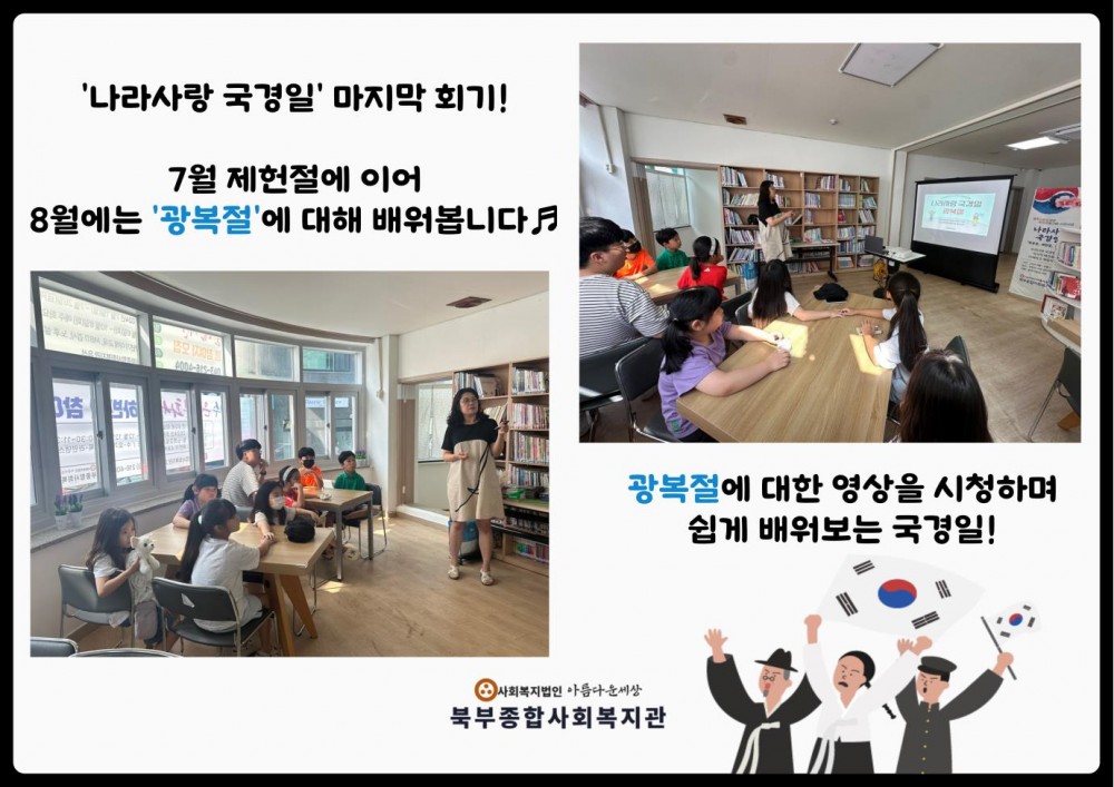 2024년 청주시립도서관 지원 사업 '나라사랑 국경일(광복절)' 페이지 정보 작성자 작성자 관리자 작성일작성일 2024.08.14 조회조회 100 본문 2024년 청주시립도서관 지원 사업 '나라사랑 국경일(광복절)' 이전글2024년 청주시립도서관 지원 사업 '여성독립운동가의 발자취를 찾아서' 다음글24년도 독거남성요리교실 프로그램 성과 공유 목록