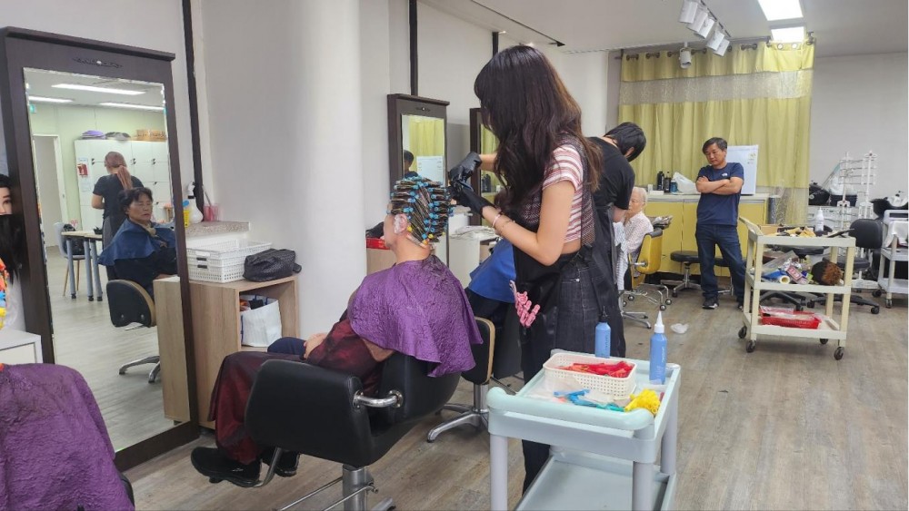 청주미용학원에서 어르신들 대상으로 파마, 염색, 컷트를 해 주셨습니다,